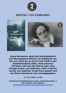 Doris Hermanns stellt die Schriftstellerin und Übersetzerin Hertha von Gebhardt vor, die von 1945 bis zu ihrem Tod 1978 in der Künstlerkolonie lebte. Deren Roman »Christian Voß und die Sterne« über eine Gruppe Juden und Jüdinnen 1942 in Berlin wurde von Gabriele Tergit hoch gelobt und von Doris Hermanns neu herausgegeben.